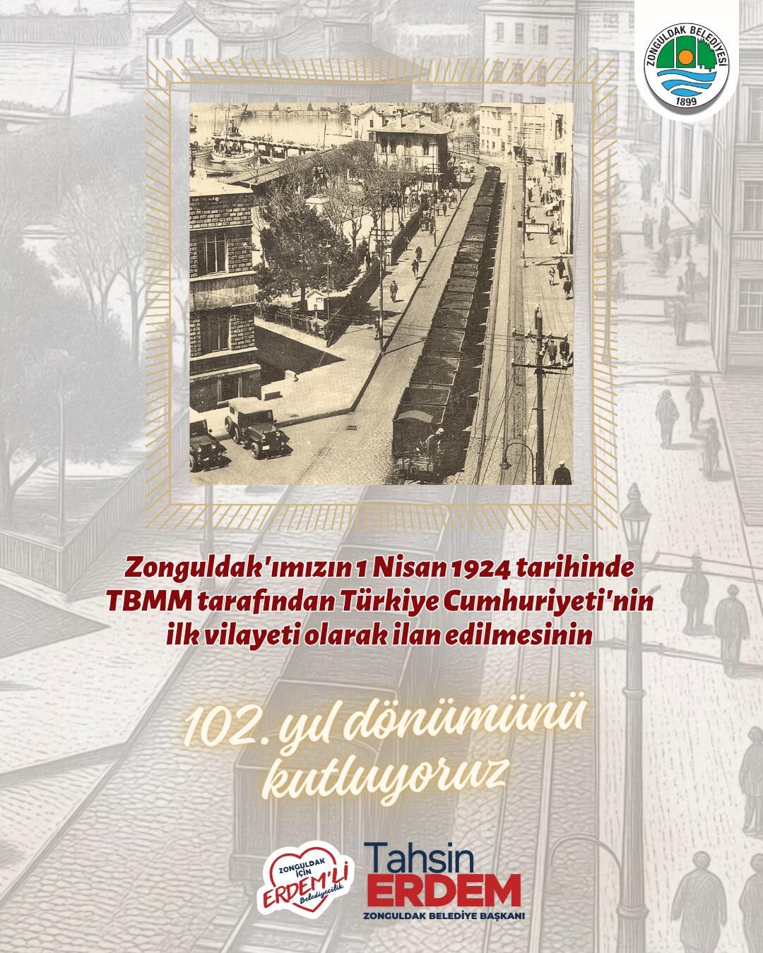 Zonguldak Belediyesi, kentin il oluşunun 102. yıl dönümü dolayısıyla bir kutlama mesajı yayımladı. Açıklamada, Zonguldak’ın 1 Nisan 1924 tarihinde Türkiye Büyük Millet Meclisi tarafından Türkiye Cumhuriyeti’nin ilk vilayeti olarak ilan edildiği hatırlatıldı.
