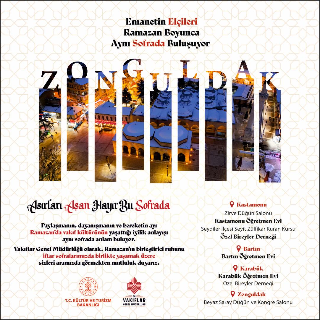 Kastamonu Vakıflar Bölge Müdürlüğü’ne bağlı iller arasında yer alan Zonguldak’ta iftar organizasyonu, Ramazan ayı boyunca Zonguldak Beyaz Saray Düğün Salonu’nda gerçekleştirilecek. Kurulacak gönül sofralarında ihtiyaç sahipleri başta olmak üzere tüm vatandaşlara ücretsiz iftar yemeği ikram edilecek.