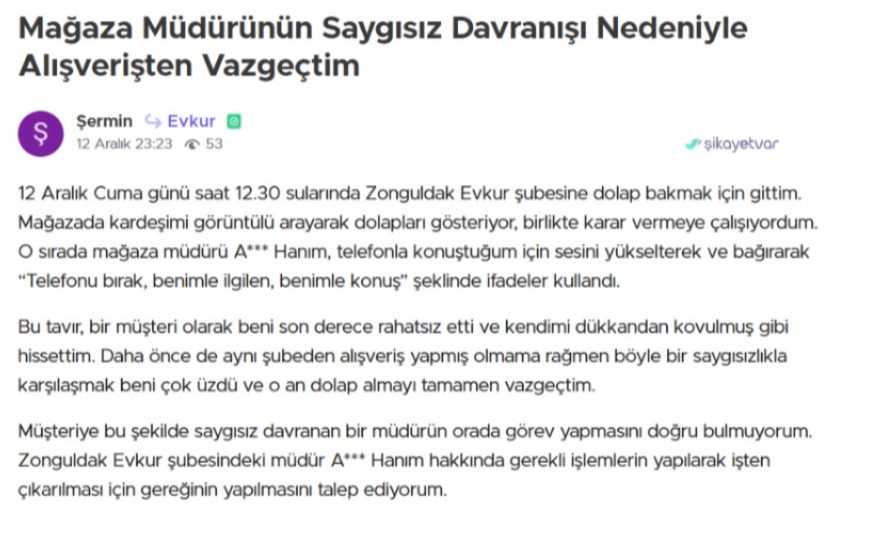 Müşteriye bu şekilde saygısız davranan bir müdürün orada görev yapmasını doğru bulmuyorum. Zonguldak Evkur şubesindeki müdür A*** Hanım hakkında gerekli işlemlerin yapılarak işten çıkarılması için gereğinin yapılmasını talep ediyorum."