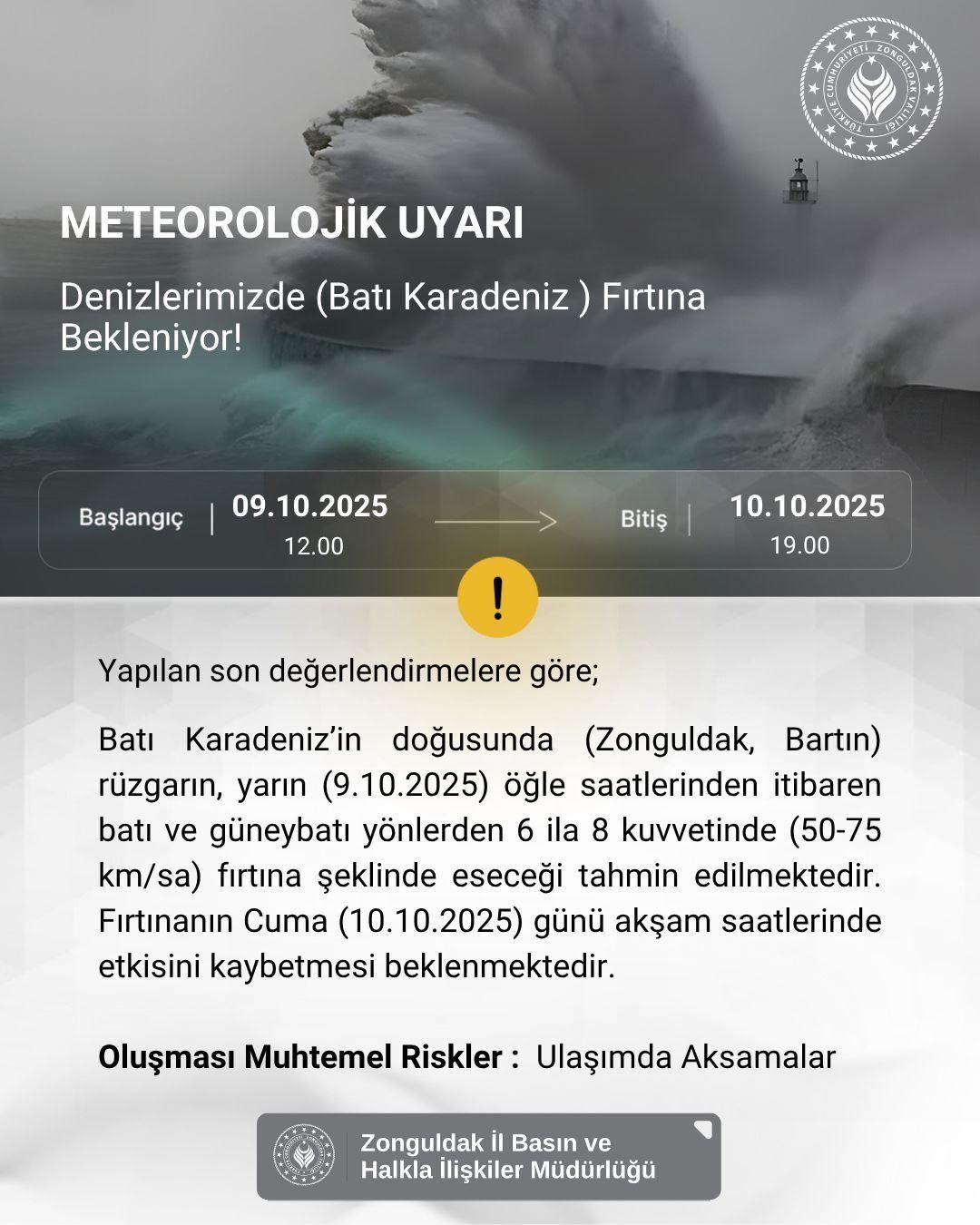 Zonguldak Valiliği'nden yapılan meteorolojik değerlendirmeye göre, Zonguldak ve Bartın'da kuvvetli fırtına bekleniyor.