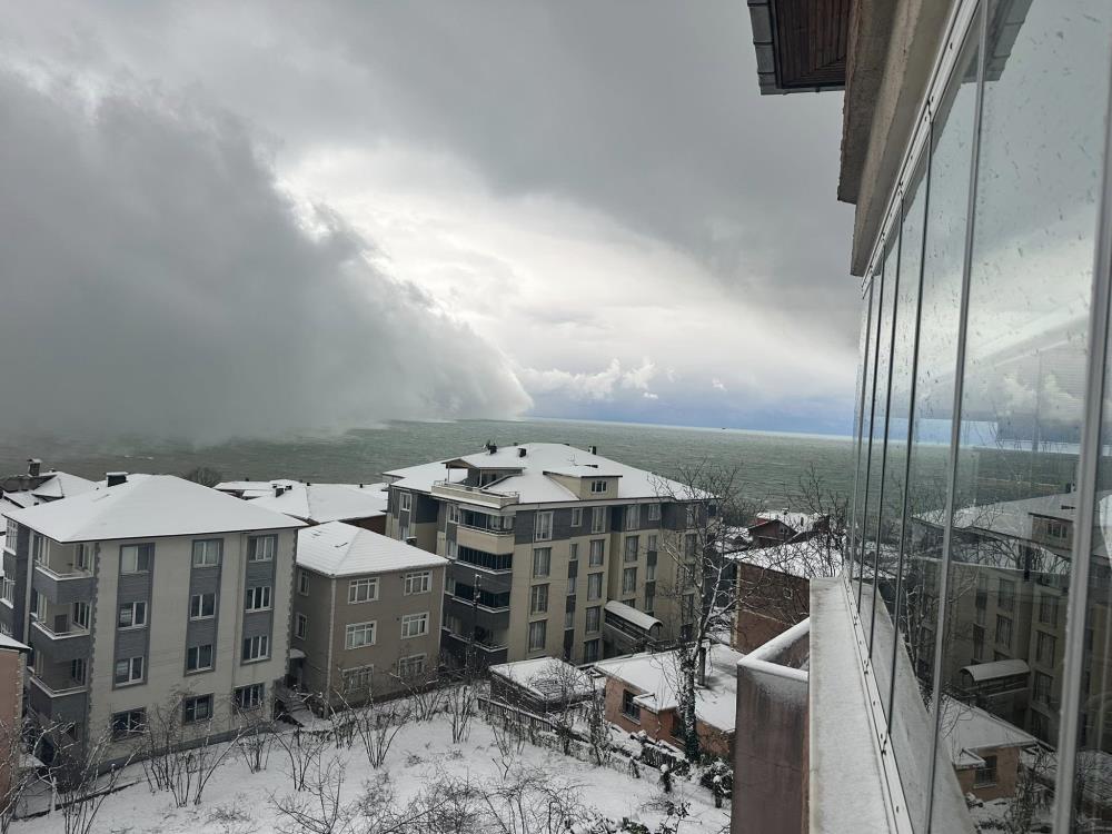 Alaplı'ya deniz üzerinden gelen yoğun kar fırtınasının görüntüsü, bir vatandaş tarafından cep telefonu kamerasıyla kaydedilirken, kısa sürede sosyal medyada yayılarak büyük ilgi gördü.