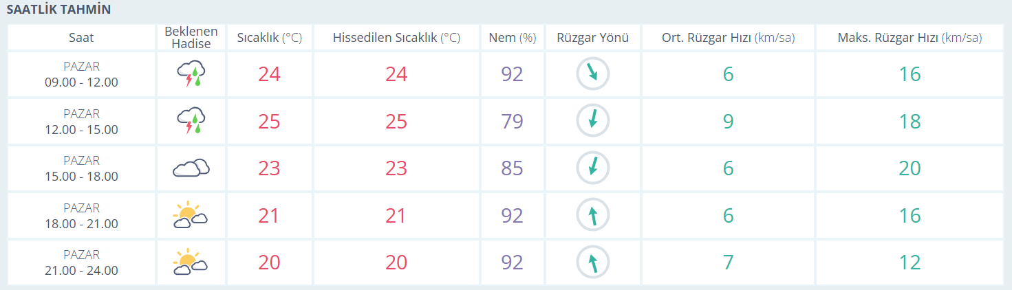 5 günlük tahmin tablosuna göre, 7 Ağustos Perşembe günü de kentte yağış bekleniyor.