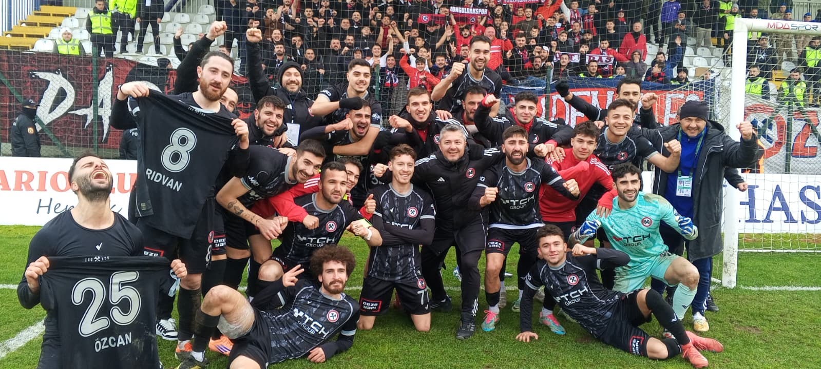Zorlu Düzcespor deplasmanında alınan galibiyet sonrasında Zonguldaksporlu futbolcular ve taraftarlar galibiyet sevincini doyasıya yaşadı.