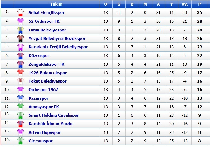 Şampiyonluk mücadelesi veren 4 takımdan Sebat Gençlikspor 35 puanla haftayı yine lider kapattı. 52 Orduspor 28 puanla 2., Fatsa Belediyespor 28 puanla 3., Yozgat Belediyesi Bozukspor 26 puanla 4.sırada yer alıyor.