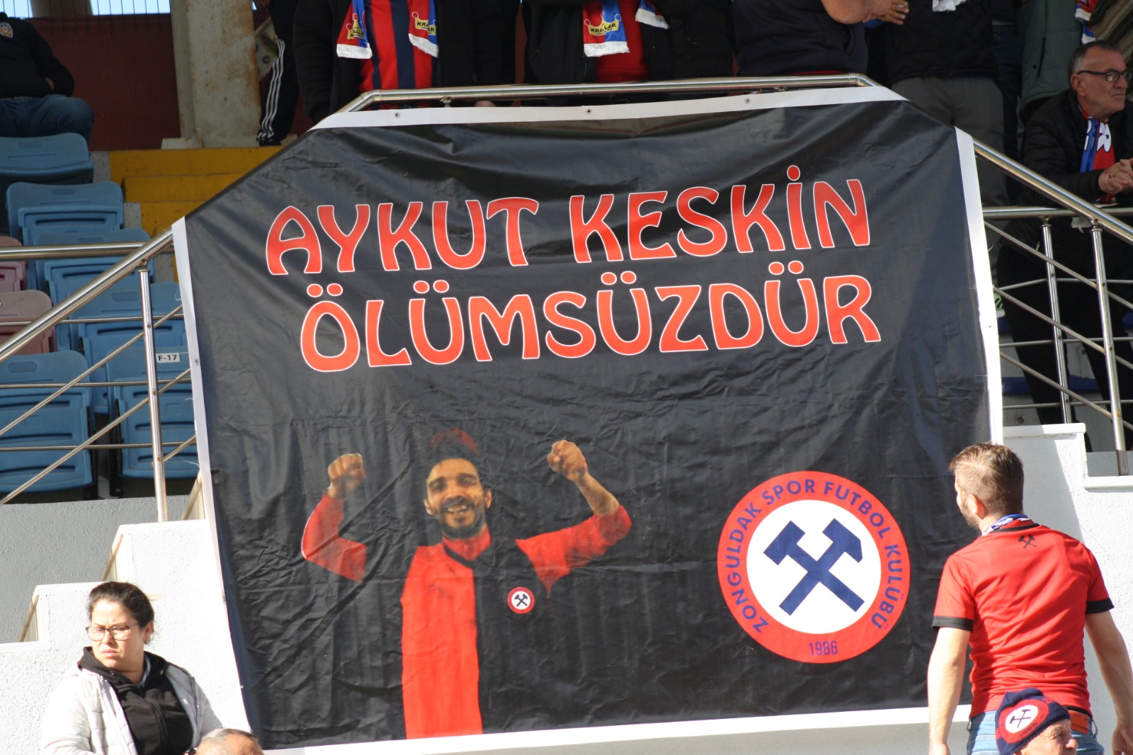 4 Kasım’da hayatını kaybeden Zonguldakspor’un sevilen taraftarı Aykut Keskin, Artvin Hopaspor maçında unutulmadı. Kırmızı-lacivertli taraftarlar tribüne “Aykut ölmedi, kalbimizde yaşıyor.” pankartı asarak, Aykut Keskin’in yakınlarının da yer aldığı maçta duygusal anlar yaşandı.