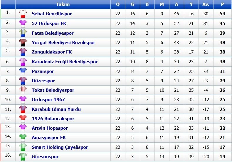 Temsilcimiz Zonguldakspor’un oynadığı 22 karşılaşmada 11 galibiyet, 5 beraberlik ve 6 mağlubiyet ile 38 puanla 5. sırada yer alıyor. Temsilcimiz 22 karşılaşmada rakip filelere 38 gol atarken, kalesinde ise 17 gol gördü.