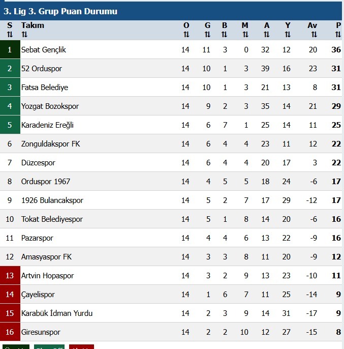 Giresunspor, 14 maçta aldığı 10 yenilgiyle ligde en fazla mağlubiyet yaşayan takım oldu. Yenilgi yüzü görmeyen tek ekip ise lider Sebat Gençlikspor olarak öne çıktı.