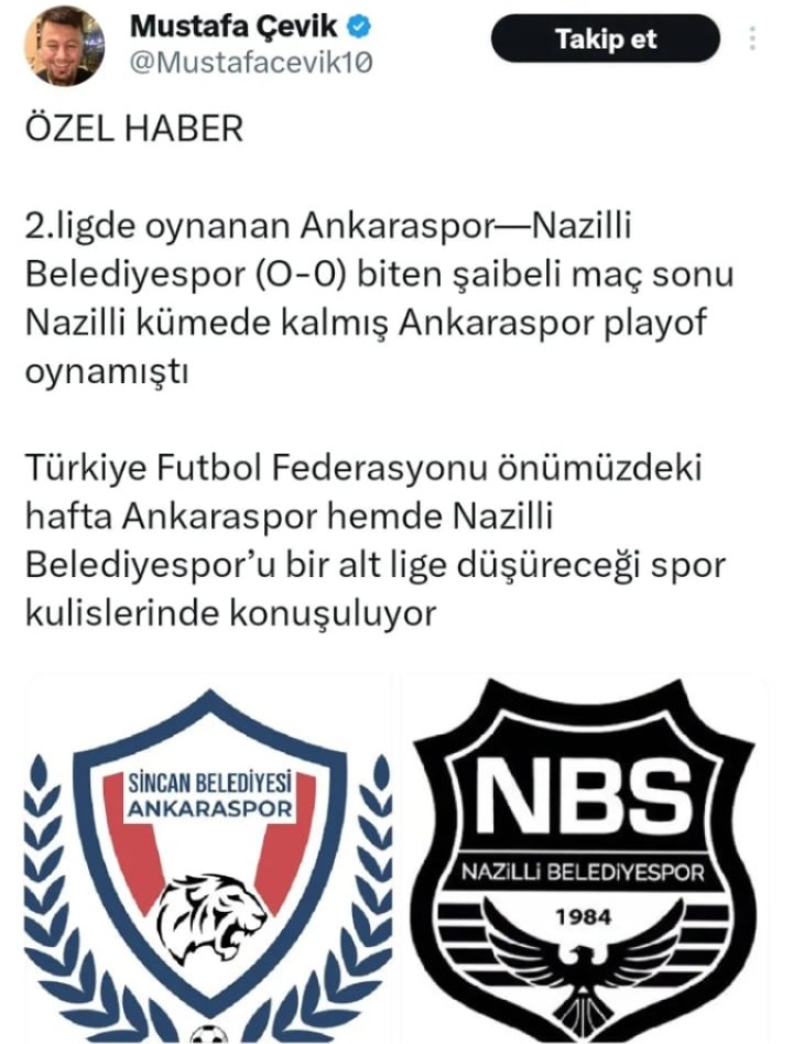 Mustafa Çevik özel haberinde şu ifadelere yer verdi: "Türkiye Futbol Federasyonu önümüzdeki hafta Ankaraspor hemde Nazilli Belediyespor'u bir alt lige düşüreceği spor kulislerinde konuşuluyor " dedi