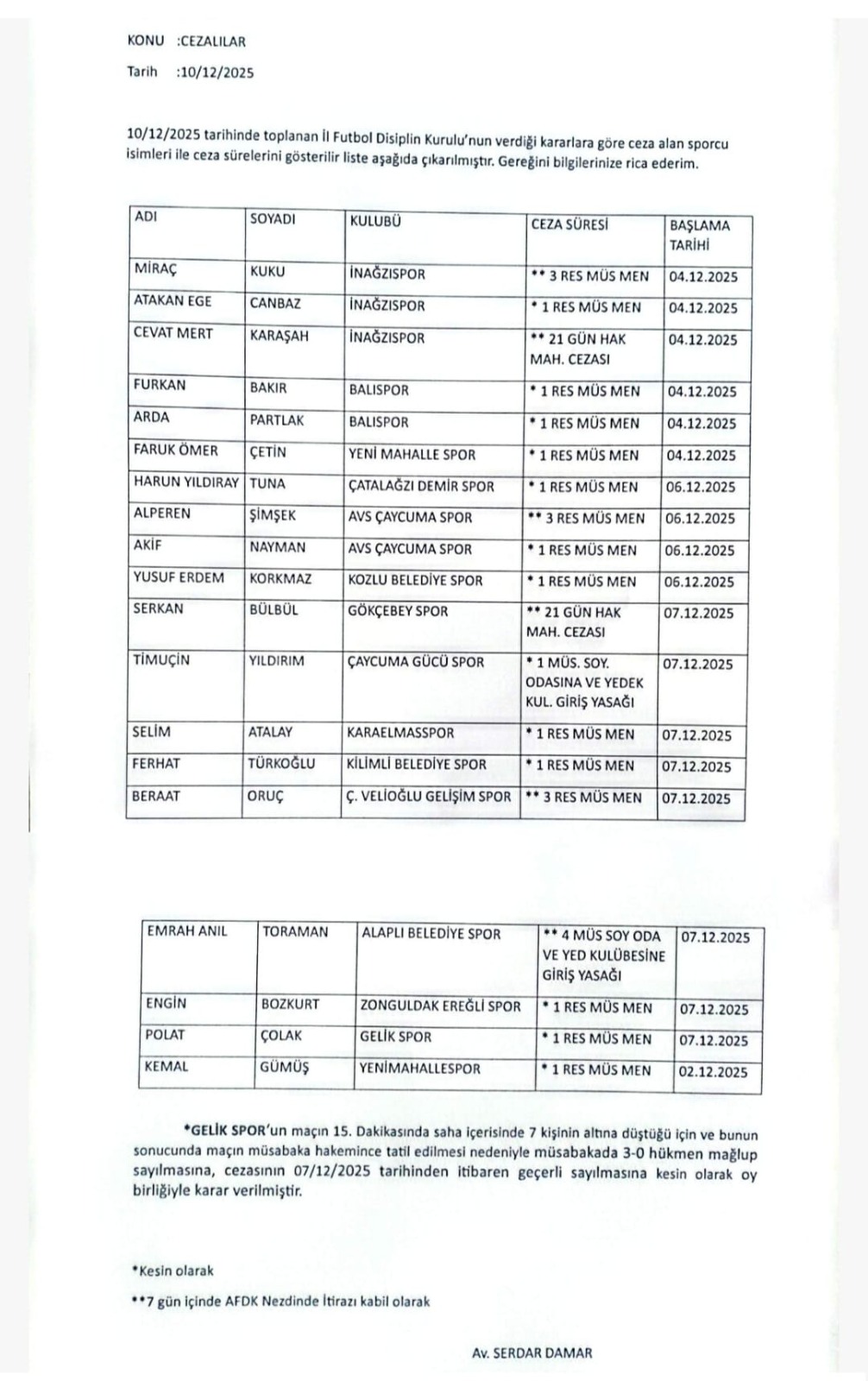 Zonguldak Futbol İl Disiplin Kurulu, çeşitli sahalarda oynanan ve sportmenliğe aykırı hareket eden futbolcular, teknik direktörler ve idarecilerinin cezalarını belirledi.