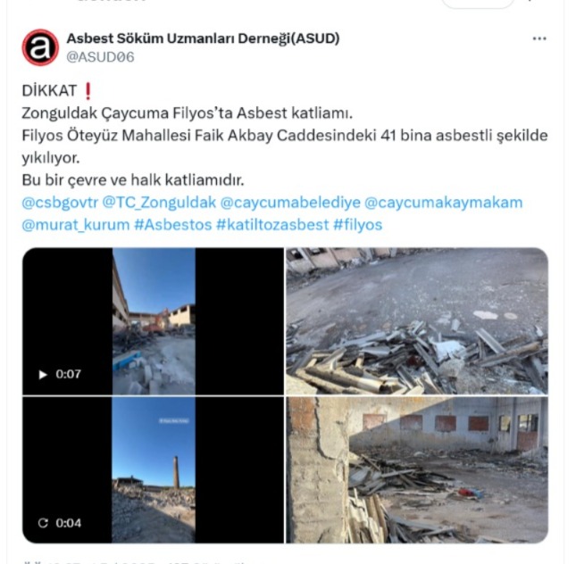 Zonguldak'ın Çaycuma ilçesine bağlı Filyos Beldesi'nde yapılan bir bina yıkımına dair görüntüler gündeme oturdu. Sosyal medya platformu X'te yayınlanan görüntülerde 41 binanın asbestli şekilde yıkıldığına dair iddialar ortaya atıldı. Görüntülerin ardından vatandaşlar yetkilileri göreve davet ederek, "Bu bir çevre katliamıdır. Yetkililerin acilen harekete geçmesi gerekiyor" diyerek tepkilerini dile getirdi.