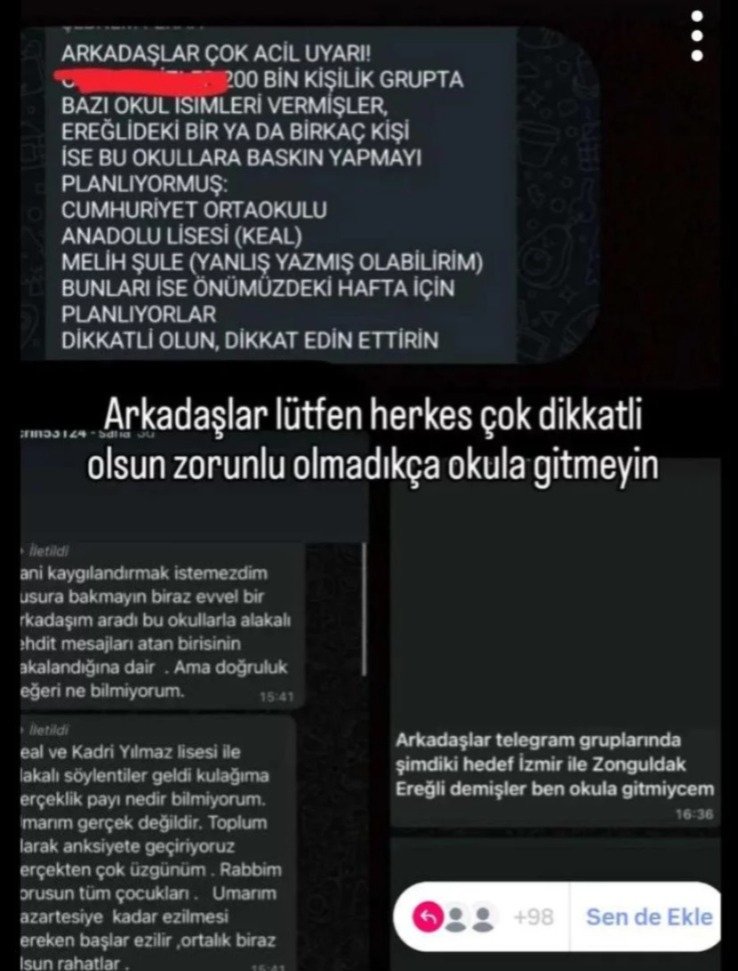 İddiaya göre bir Telegram kanalında “Ali Yağız Çolak 34” kullanıcı adıyla yapılan paylaşımda, “Bir dahaki hedefimiz Zonguldak Alaplı Anadolu Lisesi” ifadelerine yer verildi. Söz konusu mesajın kısa sürede yayılması üzerine öğrenci ve veliler arasında panik yaşandı.