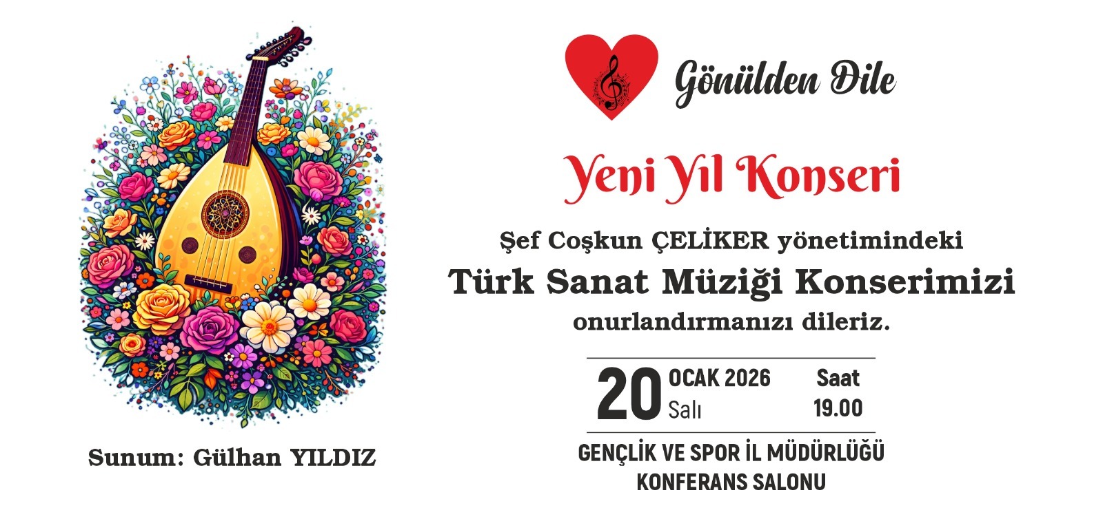 Sunumunu Gülhan Yıldız’ın yapacağı konser, Gençlik ve Spor İl Müdürlüğü Konferans Salonu'nda gerçekleşecek. Etkinlikte birbirinden güzel Türk Sanat Müziği eserleri seslendirilecek.