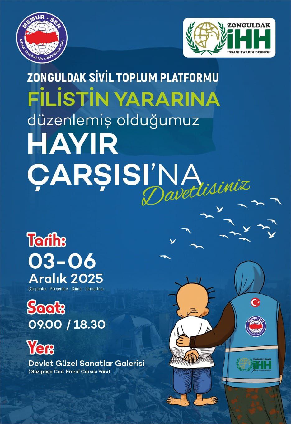 Memur-Sen ve İHH öncülüğünde oluşturulan Zonguldak Sivil Toplum Platformu, Filistin’e destek amacıyla “Hayır Çarşısı” düzenliyor. Etkinlik, Zonguldaklıları dayanışmaya davet ederken, bölgedeki insani drama dikkat çekmeyi hedefliyor.