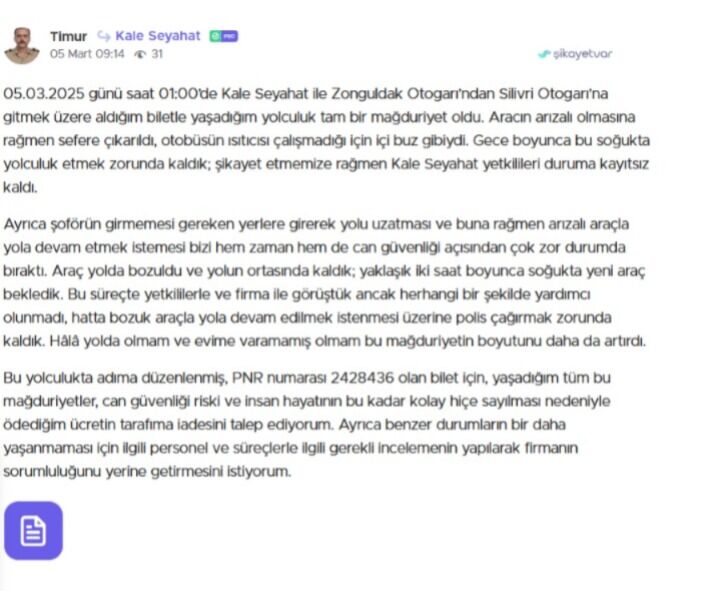 "05.03.2025 günü saat 01:00’de Kale Seyahat ile Zonguldak Otogarı’ndan Silivri Otogarı’na gitmek üzere aldığım biletle yaşadığım yolculuk tam bir mağduriyet oldu. Aracın arızalı olmasına rağmen sefere çıkarıldı, otobüsün ısıtıcısı çalışmadığı için içi buz gibiydi. Gece boyunca bu soğukta yolculuk etmek zorunda kaldık; şikayet etmemize rağmen Kale Seyahat yetkilileri duruma kayıtsız kaldı.